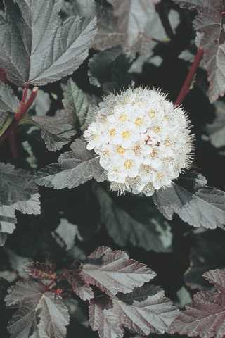 Upright, spreading deciduous shrub with dark purple leaves. Small pinkish-white flowers are in dense rounded clusters in late spring. After flowering drooping clusters of reddish fruit appear. Gives great winter interest. Propagation prohibited.