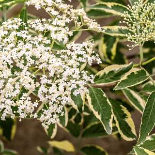 Large clusters of fragrant, lacy white flowers form in early summer on this tall, wide-growing shrub. Variegated white and creamy coloured leaves strikingly compliment the flowers, and if a pollinator is present, masses of small dark fruit will form in fall. The edible fruit are relished by song birds. Can be trained into a small accent tree or large shrub. USDA Zone 4.