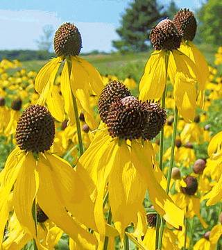 This hardy, adaptable Coneflower produces an abundance of showy, bright yellow flowers that open on strong, slender stems in summer. The flowers are up to 7.5cm/3" across and have drooping petals that surround a prominent chocolate brown cone. Flourishes in full sun, average to low moisture and average to poor soils. Drought tolerant. Attracts pollinators.